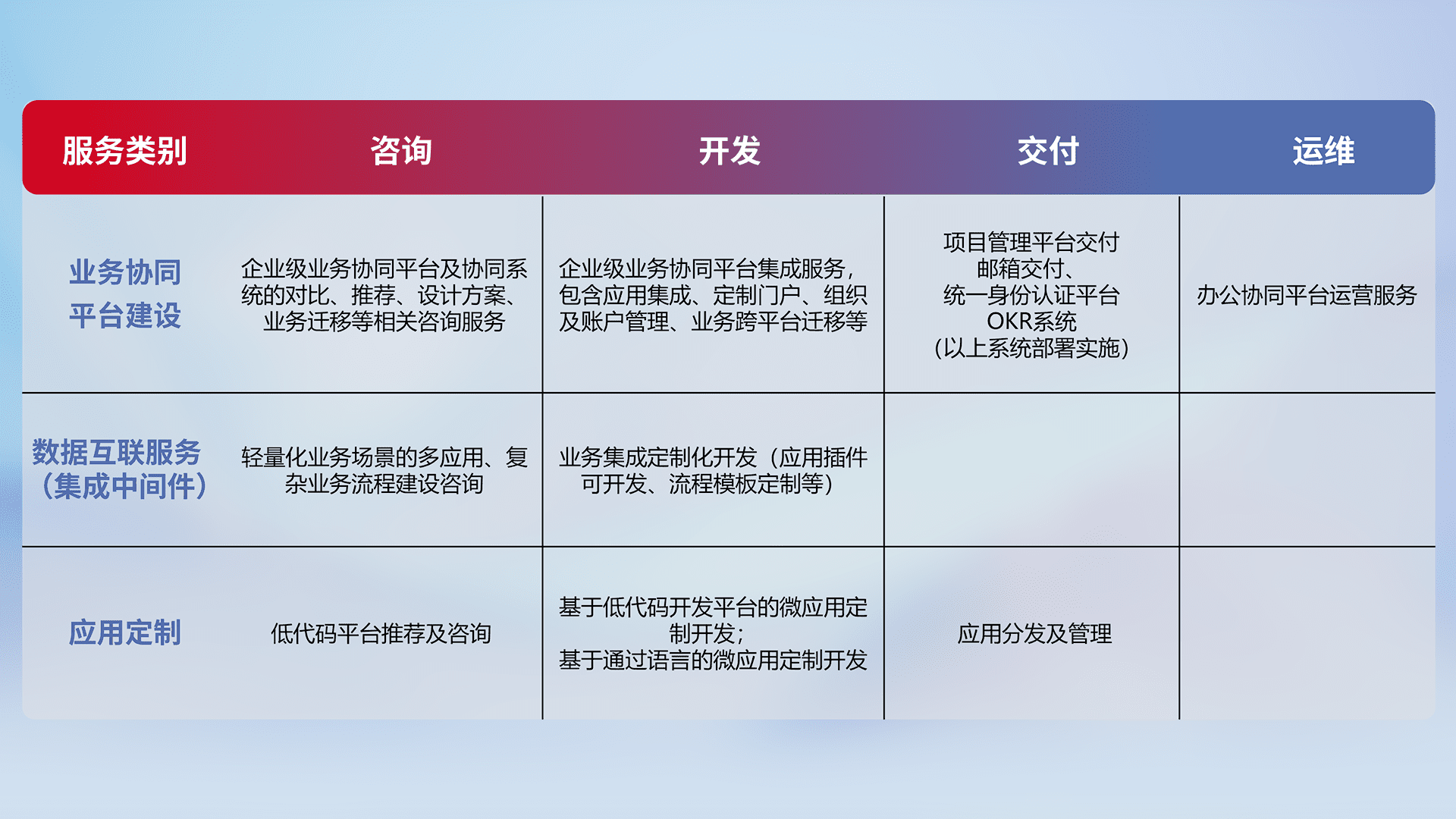 针对钉钉、、、、企微、、、、IDaas等平台级产品提供产品的规划、、、、方案、、交付、、、、定制化开发等服务,,,,实现如统一协同办公、、、、智能客户服务、、、混合会议管理、、、智能数据查询、、、、等业务场景,,,实现数字化转型。。。